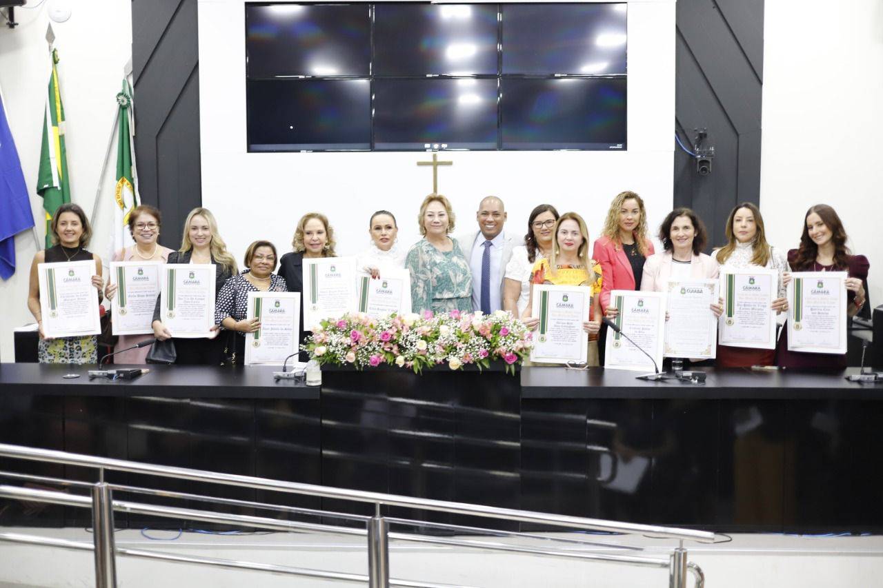 O presidente da Câmara de Cuiabá, o vereador Juca do Guaraná Filho (MDB), homenageou, em sessão solene, nesta quarta-feira (27), 59 mulheres, dentre elas desembargadoras, juízas, servidoras do Poder Judiciário de Mato Grosso e policiais femininas. As homenageadas receberam moções de aplausos e títulos Mulher Cidadã Ana Maria do Couto, ainda em alusão ao Dia Internacional da Mulher, celebrado em 8 de março.