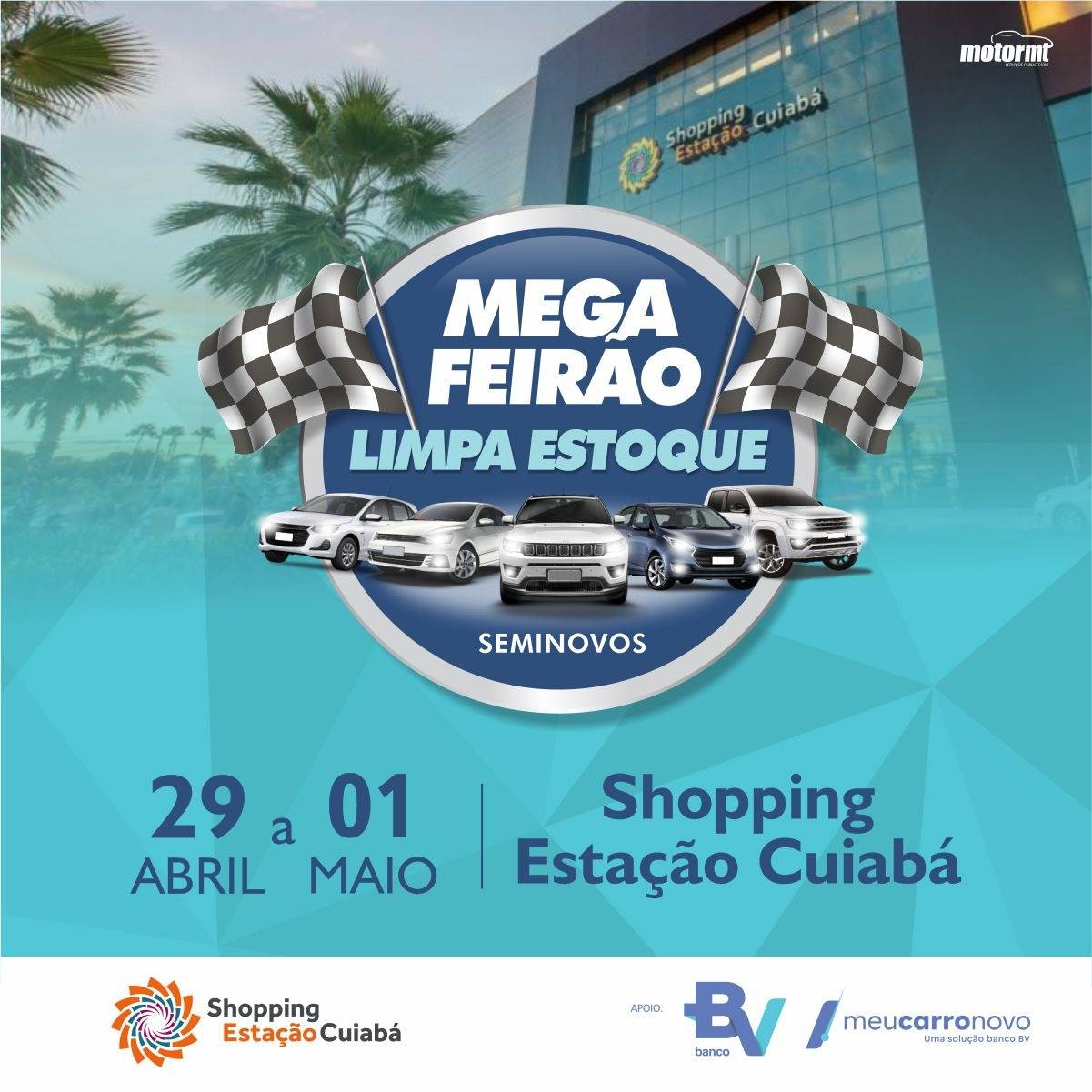 Serviço: Feirão de Carros Multimarcas nos dias 29/04, 30/04 e 01/05 das 9h às 22h no estacionamento externo do Shopping Estação Cuiabá.