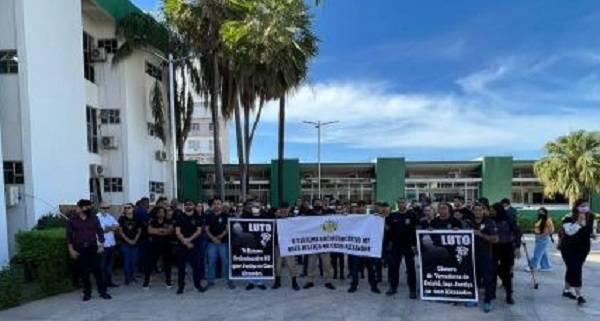 Agentes penais se reuniram hoje na frente da Câmara pedindo que seja aberta investigação pela Comissão de ética contra o parlamentar Marcos Paccola (Republicanos).