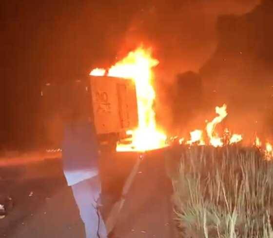 O veículo de carga, como se vê nas imagens, pegou fogo. Um homem morreu e teve o corpo carbonizado enquanto estava caído na rodovia.