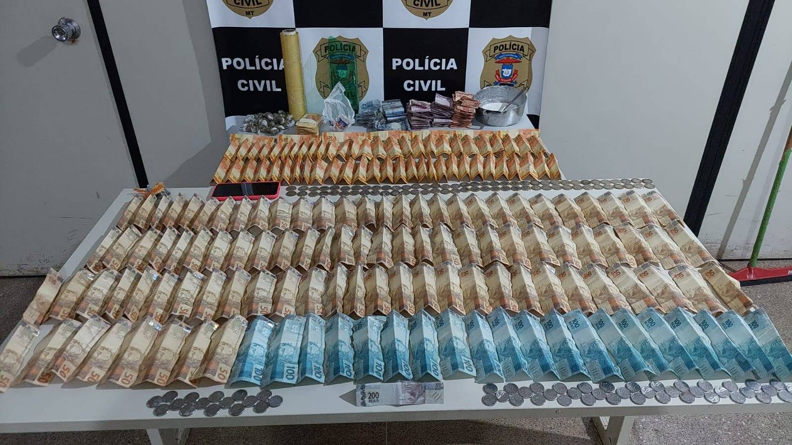 Escondidos em pequenos rolos dentro do quarto da suspeita, os policiais localizaram R$ 10.000,00, além de papel filme utilizado para embalar entorpecentes.