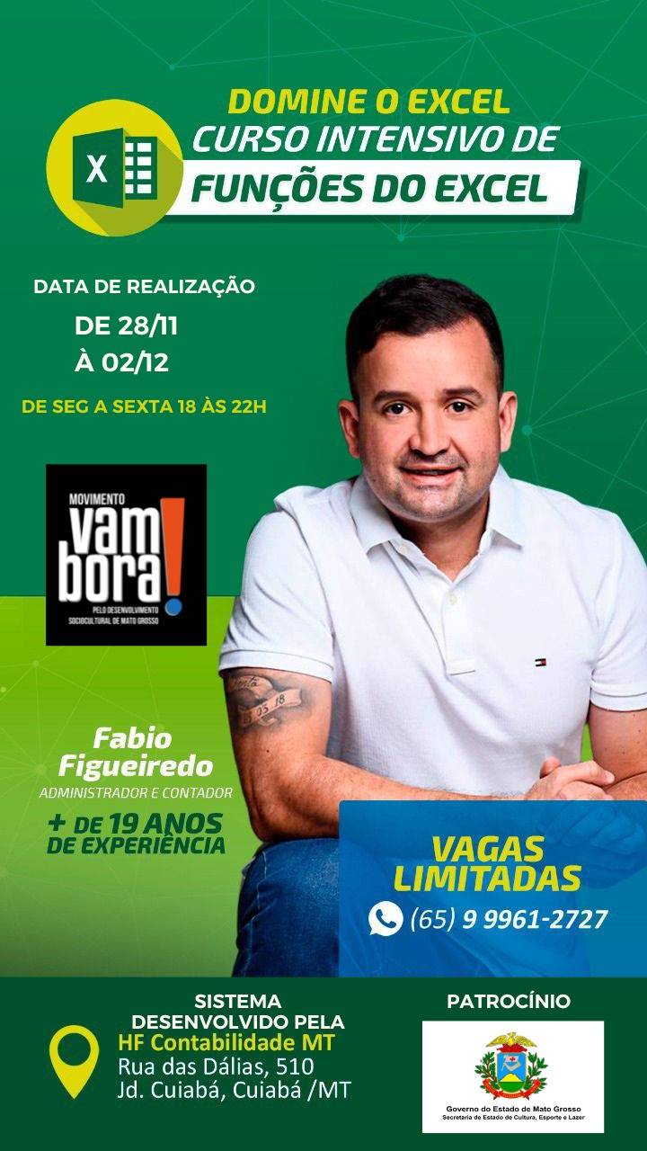Idealizado diante da necessidade de auxiliar artistas, produtores e demais setores para o mercado de trabalho e rotinas do dia a dia, o curso gratuito em funções do Excel é uma realização do Movimento Vambora, em parecia com a HF Contabilidade e capacitará três turmas, sendo que a primeira dela já tem início no próximo dia 14 de novembro e segue até o dia 18, a partir da 18h, na sede da HF Contabilidade no Jardim Cuiabá. As vagas são limitadas.