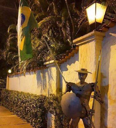 Com a nota, aparece a estátua de Dom Quixote, que fica na entrada do Talavera, aparece enfeitada com a bandeira do Brasil.