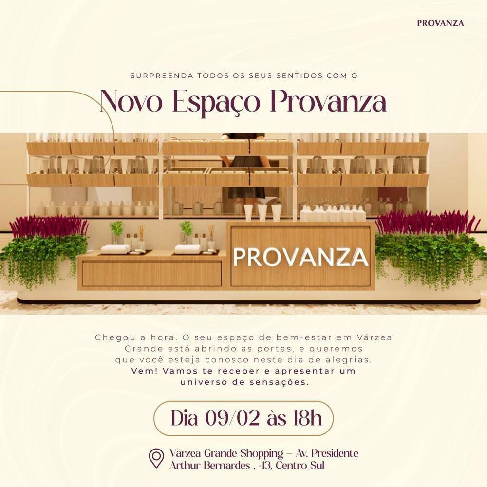 Produtos voltados para o bem-estar, melhora da qualidade de vida e cuidados com a casa são alguns dos itens oferecidos à população de Várzea Grande, com a inauguração do novo espaço Provanza, no Várzea Grande Shopping. A inauguração oficial ocorre dia 09/02, a partir das 18h.