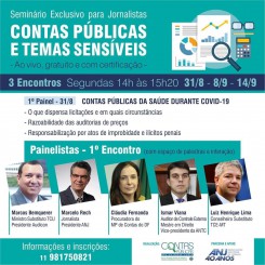 Seminário realizado em três encontros virtuais, por meio de palestras e debates, a respeito de contas públicas relacionados a saúde, obras públicas paralisadas e fiscalização de verbas parlamentares. Inscrições abertas para jornalistas, estudantes de jornalismo, e também para profissionais de comunicação do poder público. Gratuito e com certificação.