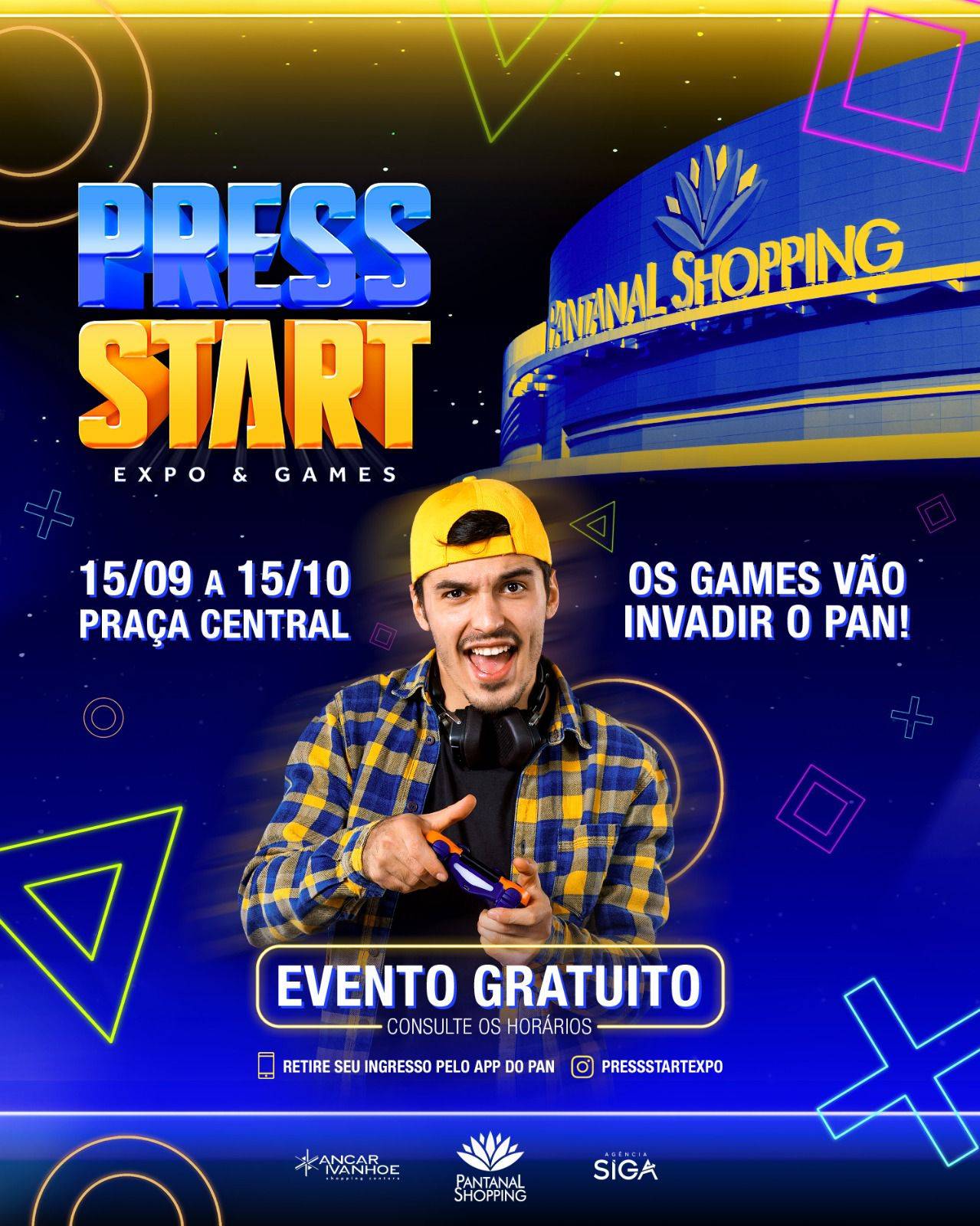 O evento Press Start - Expo & Games em Cuiabá é gratuito e ocorrerá de segunda a sábado, das 12h às 21h, e aos domingos, das 12h às 20h. Os ingressos podem ser retirados, gratuitamente, no aplicativo do Pantanal Shopping.