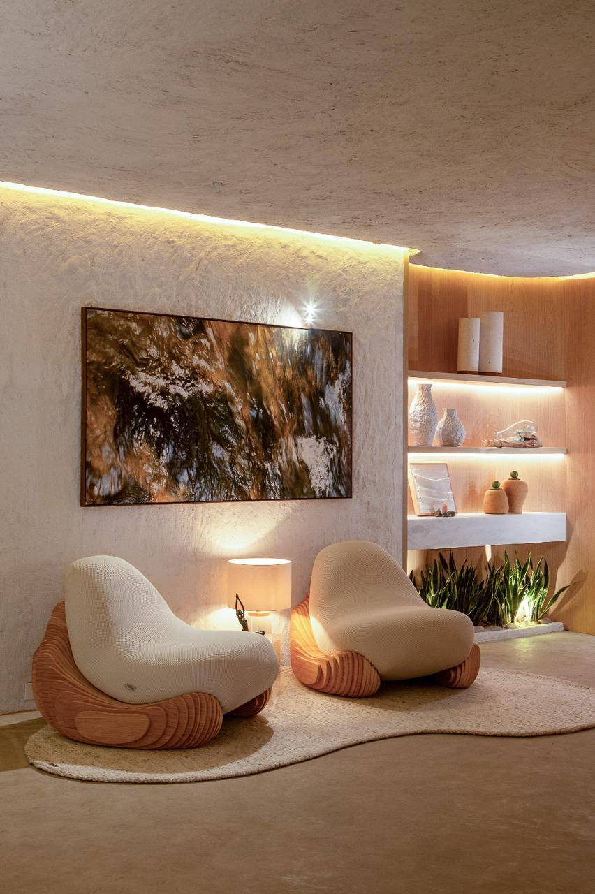 Parcerias estratégicas são a base deste projeto, e a coleção Amara, de Casa Bellarte, junto com os revestimentos de argila, cria uma harmonia entre o minimalismo presente no ambiente e a natureza, reforçando a busca pela conexão entre artesanato e bem-estar.