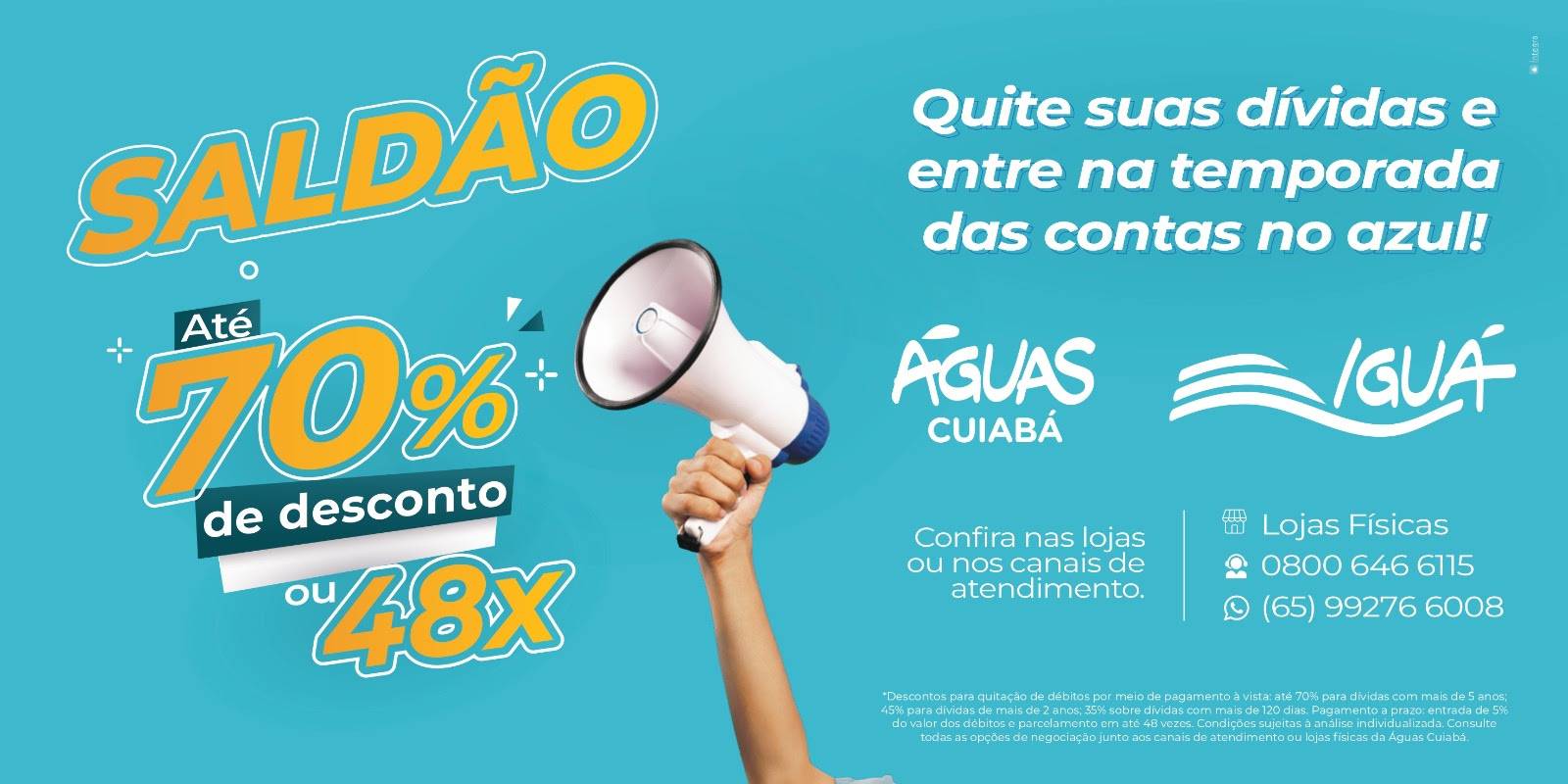 Na última semana do ano, uma oportunidade para fechar o ano com as contas no azul. Com facilidades na negociação de débitos, o Saldão da Águas Cuiabá vai até domingo, 31 de dezembro. Entre as oportunidades ofertadas, descontos que podem chegar a 70% para pagamento à vista e parcelamento em até 48 vezes, conforme opções de transação comercial para o cliente.