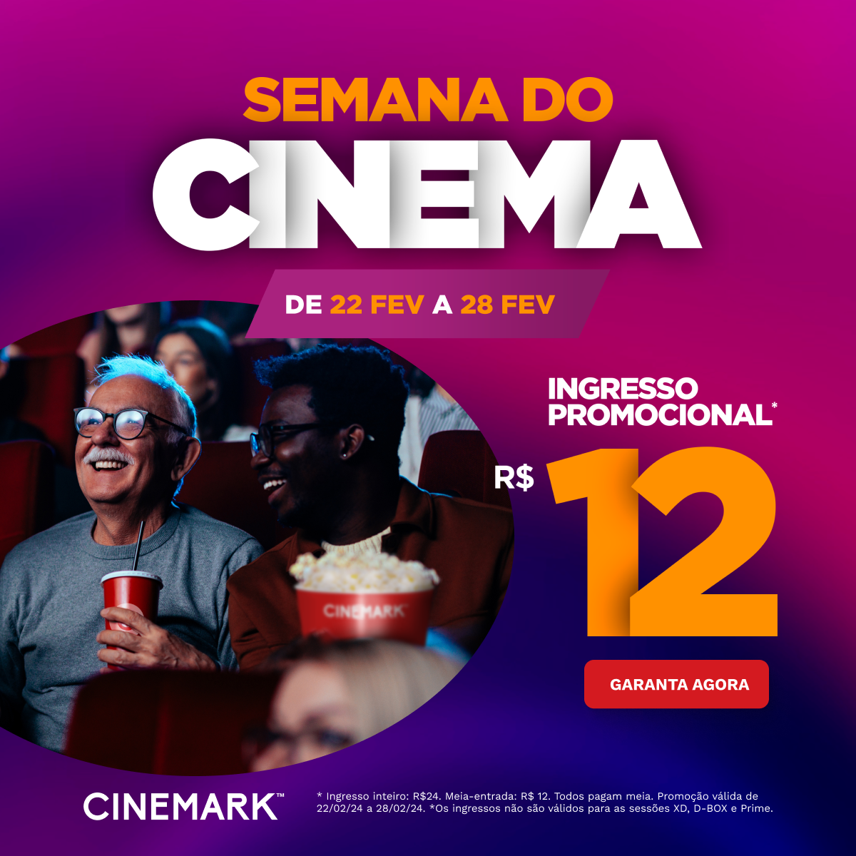 A promoção acontece de 22 a 28 de fevereiro. Combos com pipoca e refrigerante também terão preços especiais
