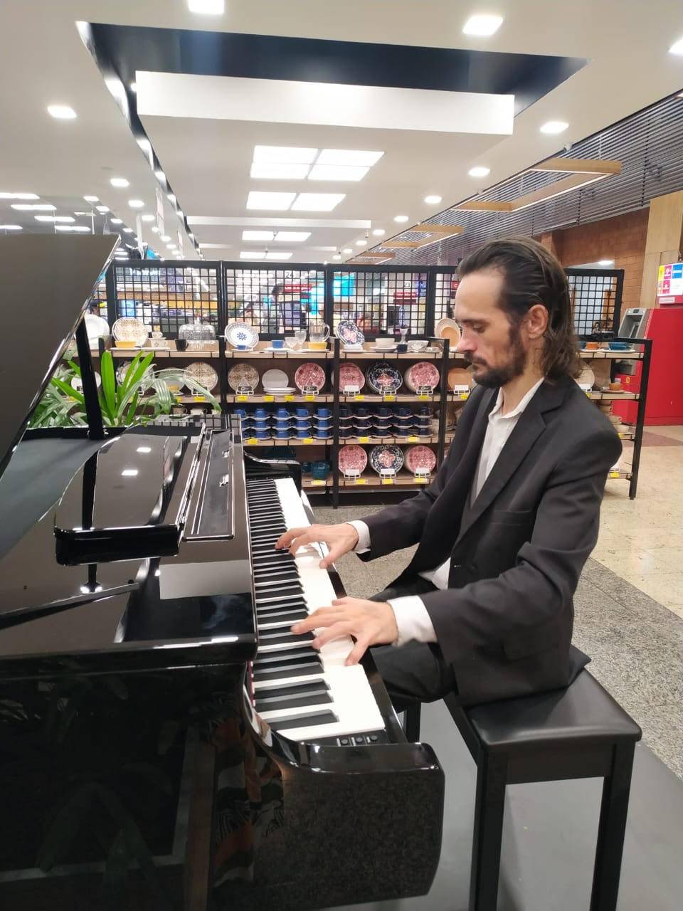 Uma oportunidade para fazer bons negócios e encantar a alma. O pianista Arthur Scharneski é autodidata com mais de 20 anos de experiência atuando e tocando em diversas áreas e estilos musicais. O mato-grossense, de Rondonópolis, contou que o seu primeiro contato e aprendizado com a música foi aos 9 anos. Iniciou no teclado e foi adquirindo experiências em diversas áreas e estilos musicais no repertório popular, com o tempo e ainda de forma autodidata começou a se interessar pelo piano aonde teve novas experiências atuando em orquestras e realizando trabalhos como pianista solo, porém com um repertório mais clássico e temático. “Minhas influências e experiências nos diversos universos da música me proporcionam hoje, como pianista solo, um vasto repertório que vai do clássico ao contemporâneo, da idade média aos dias atuais, passando por, Mozart, Vivaldi Beethoven, Chopin, Liszt, Tchaikovsky, Villa Lobos”, contou.