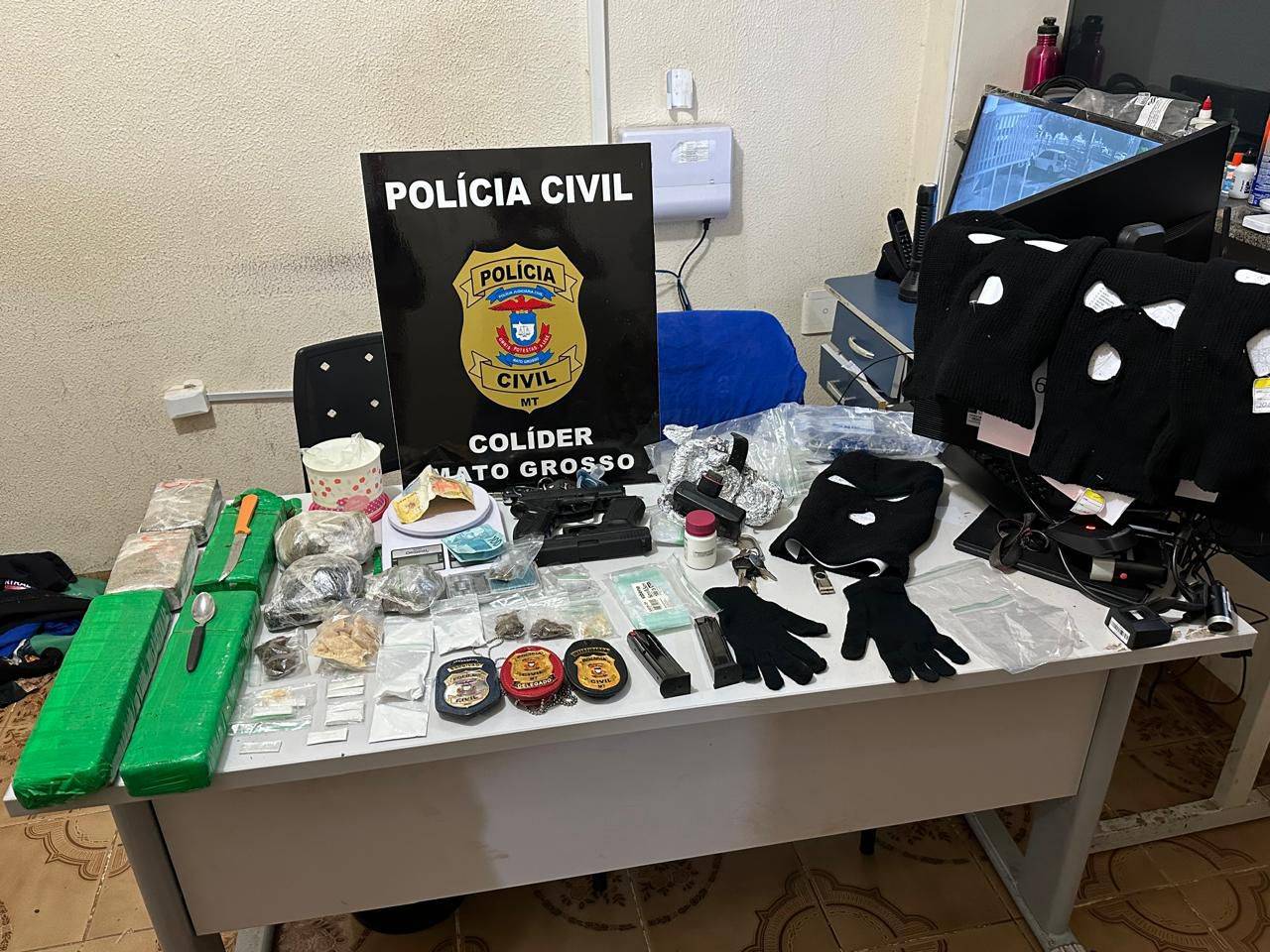 Dois criminosos envolvidos em um homicídio, ocorrido na manhã de sábado (24.08), em Colíder, foram presos em flagrante em ação rápida realizada pela Polícia Civil logo após o crime. Além da prisão dos suspeitos, a ação resultou na apreensão de drogas, armas, balaclavas, carregadores, dentre outros objetos de origem ilícita.