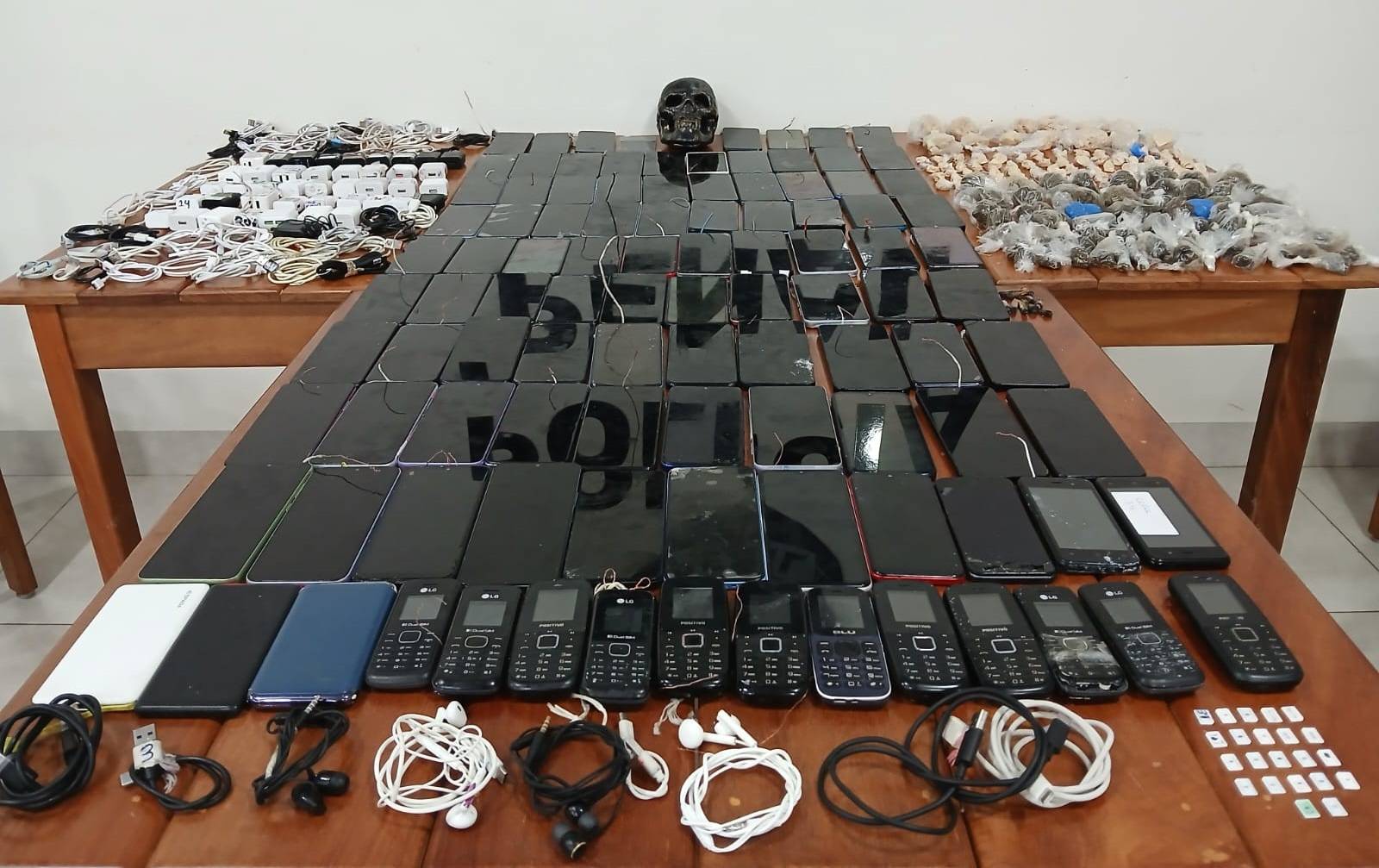 Essa verificação resultou na apreensão de 89 porções de pasta base de cocaína, 72 porções de maconha, 10 cigarros de maconha, 101 celulares (entre smartphones e aparelhos analógicos), 43 carregadores e três carregadores portáteis.
