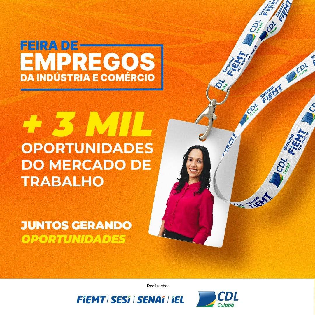 Mais de 3 mil vagas de trabalho serão ofertadas por cerca de 300 empresas na maior Feira de Empregos da Indústria e Comércio de Mato Grosso. A iniciativa, que já está na sua segunda edição, é uma ação conjunta com a Câmara de Dirigentes Lojistas (CDL Cuiabá) e Sistema Federação das Indústrias do Estado de Mato Grosso (Fiemt), por meio do Instituto Euvaldo Lodi (IEL), com apoio da Faculdade de Tecnologia Senai de Mato Grosso (Fatec).