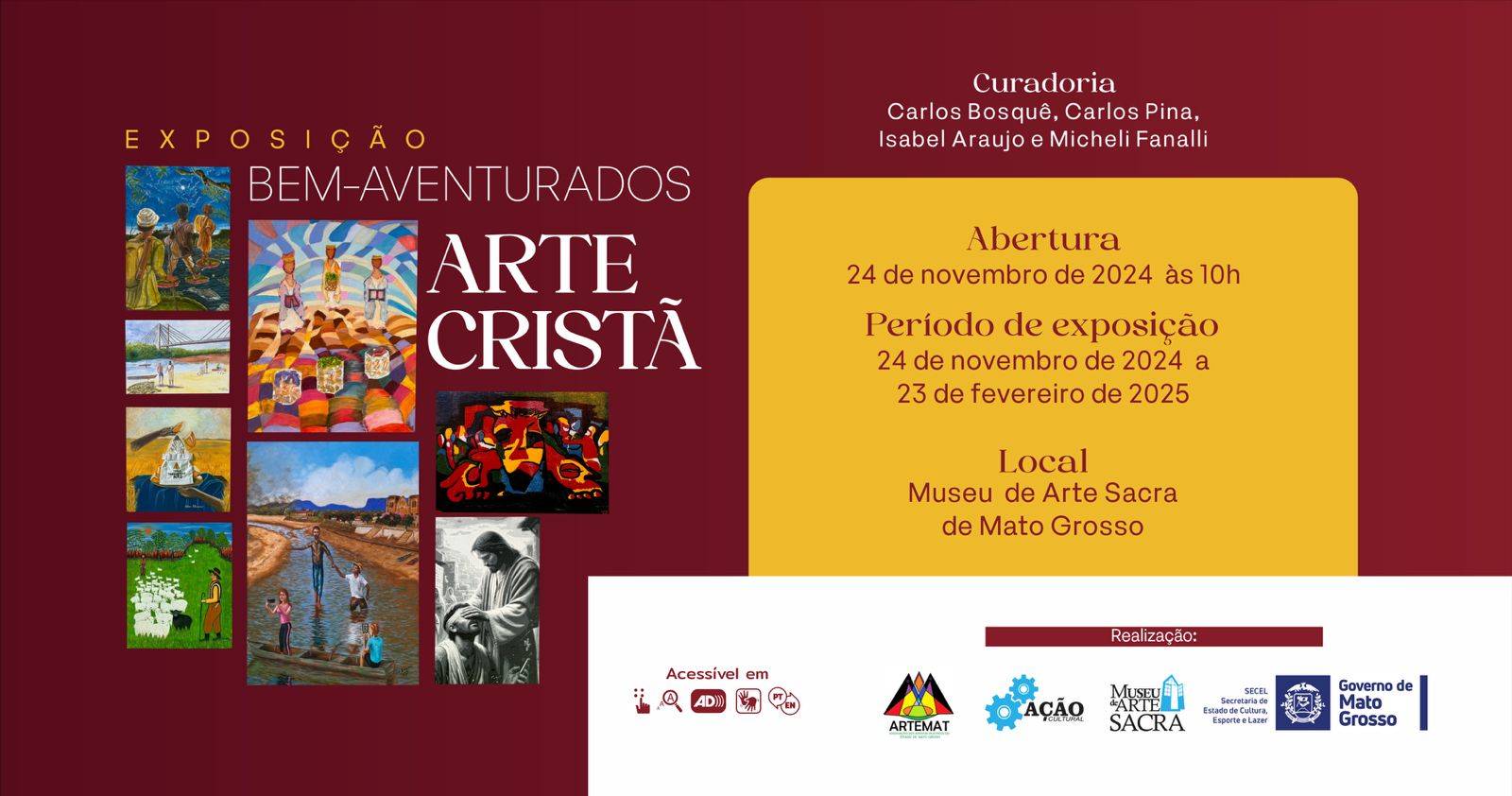 O Museu de Arte Sacra de Mato Grosso (MAS-MT) abre no próximo dia 24, a exposição “Bem-Aventurados - Arte Cristã”, mostra que reúne 33 artistas que vão recriar a história mais famosa da bíblia: a vida de Jesus Cristo, da anunciação à ressurreição. O projeto que é uma verdadeira jornada visual é uma realização da Secretaria de Estado de Cultura, Esporte e Lazer de Mato Grosso (Secel-MT), do MAS-MT, da Associação dos Produtores Culturais de Mato Grosso (Ação Cultural), juntamente com a Associação dos Artistas Plásticos de Mato Grosso (Artemat).