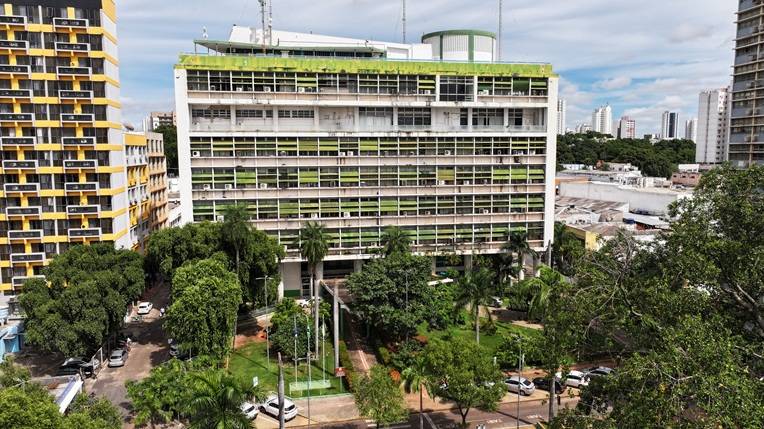 A matéria é ilustrada com a foto do prédio da Prefeitura de Cuiabá captada por drone. A imagem aérea mostra o Palácio Alencastro cercado de árvores e com detalhes da pintura verde e branca na fachada.