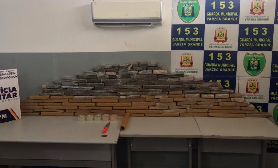 Policiais militares do 4º Batalhão aprenderam 117 tabletes de maconha, foram apreendidos cinco rolos de fita adesiva e um rolo de plástico filme em uma cas ano bairro Nova Esperança em Várzea Grande.