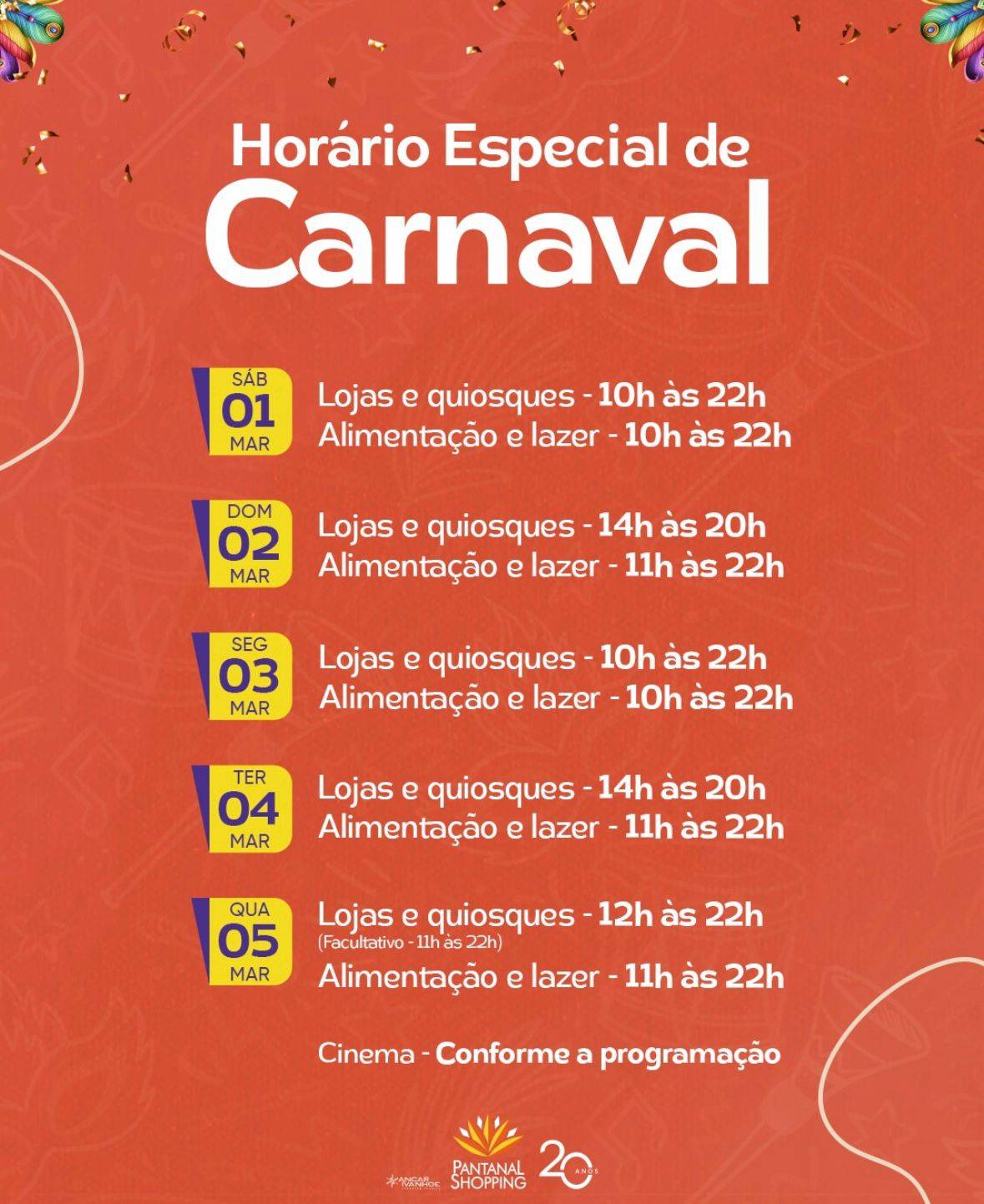 Durante o feriado de Carnaval, o Pantanal Shopping terá um horário de funcionamento diferenciado, oferecendo diversas atrações e opções de lazer para toda a família. Confira a programação: