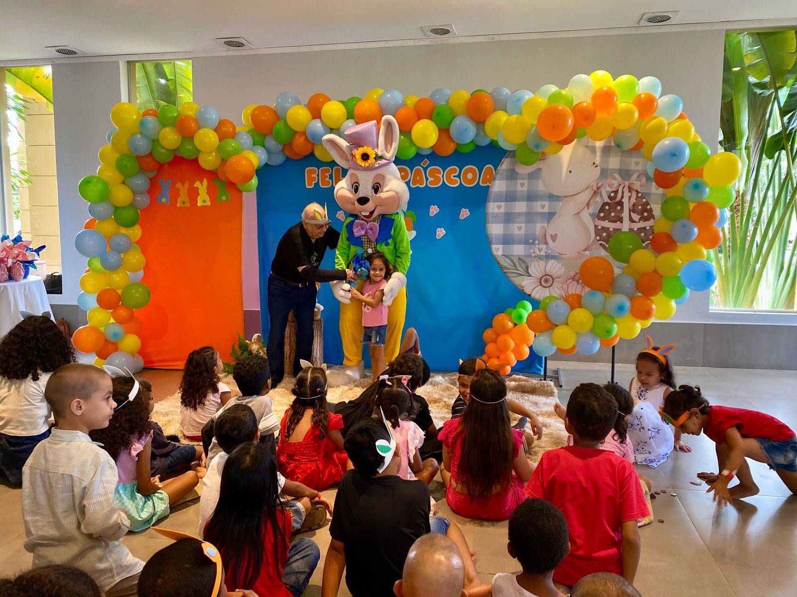As crianças atendidas pela instituição foram presenteadas com chocolates, participaram de atividades recreativas com brincadeiras, lanche e receberam a visita do coelhinho da Páscoa.