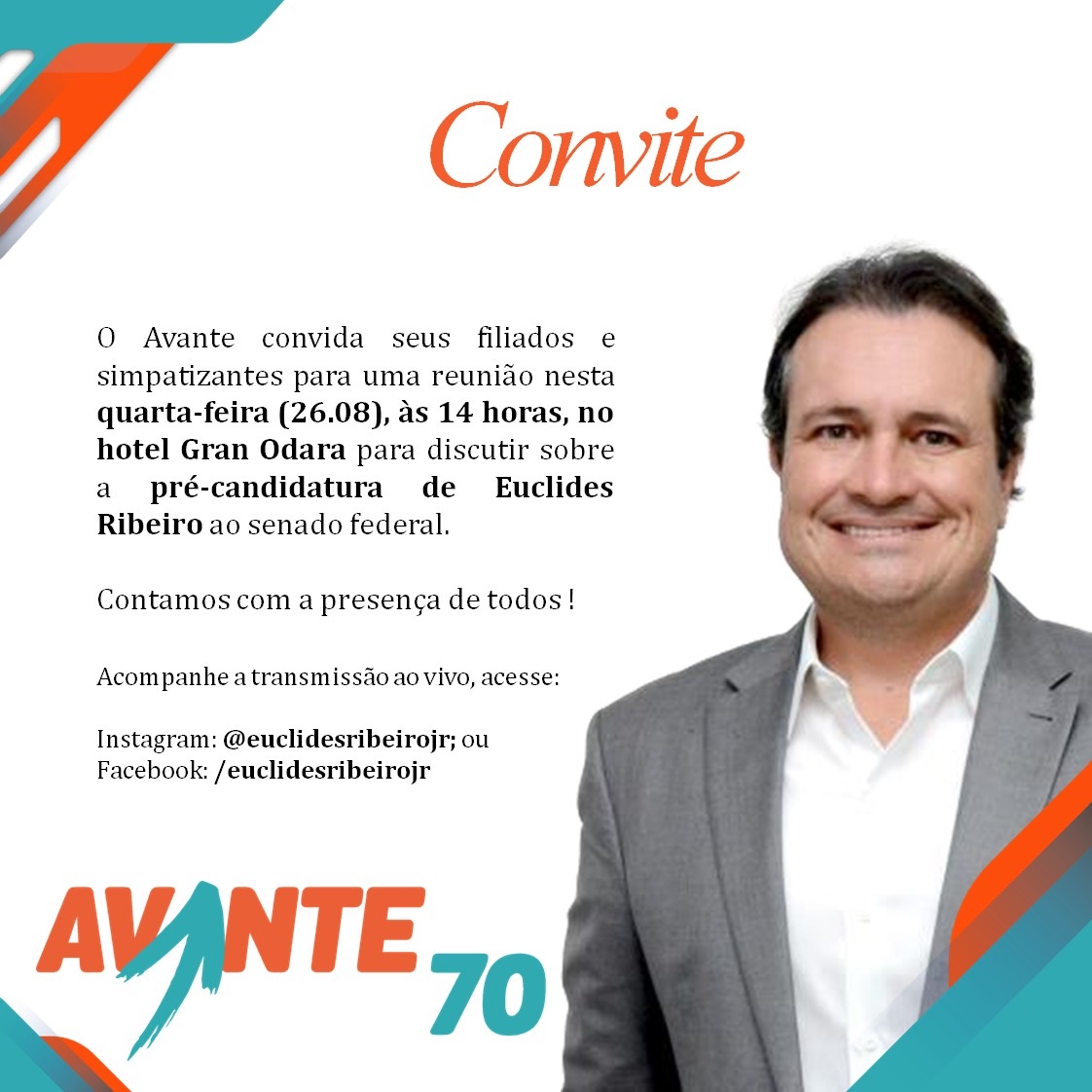 O partido Avante convida a imprensa, filiados e simpatizantes para acompanhar reunião que acontecerá nesta quarta-feira (26), às 14 horas, no hotel Grand Odara, em Cuiabá, para debater a pré-candidatura de Euclides Ribeiro ao Senado Federal.