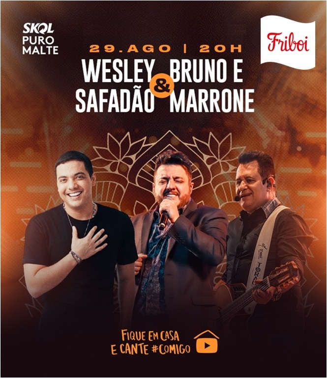Neste próximo sábado (29), a partir das 20h, acontece a live conjunta da dupla Bruno & Marrone com o cantor Wesley Safadão. O evento musical, que ainda terá a participação do humorista Tirullipa, contará com patrocínio da Friboi. Durante a transmissão, a empresa de carne bovina promoverá sua marca-mãe Friboi e também a Maturatta Friboi – A Carne do Churrasco Perfeito.