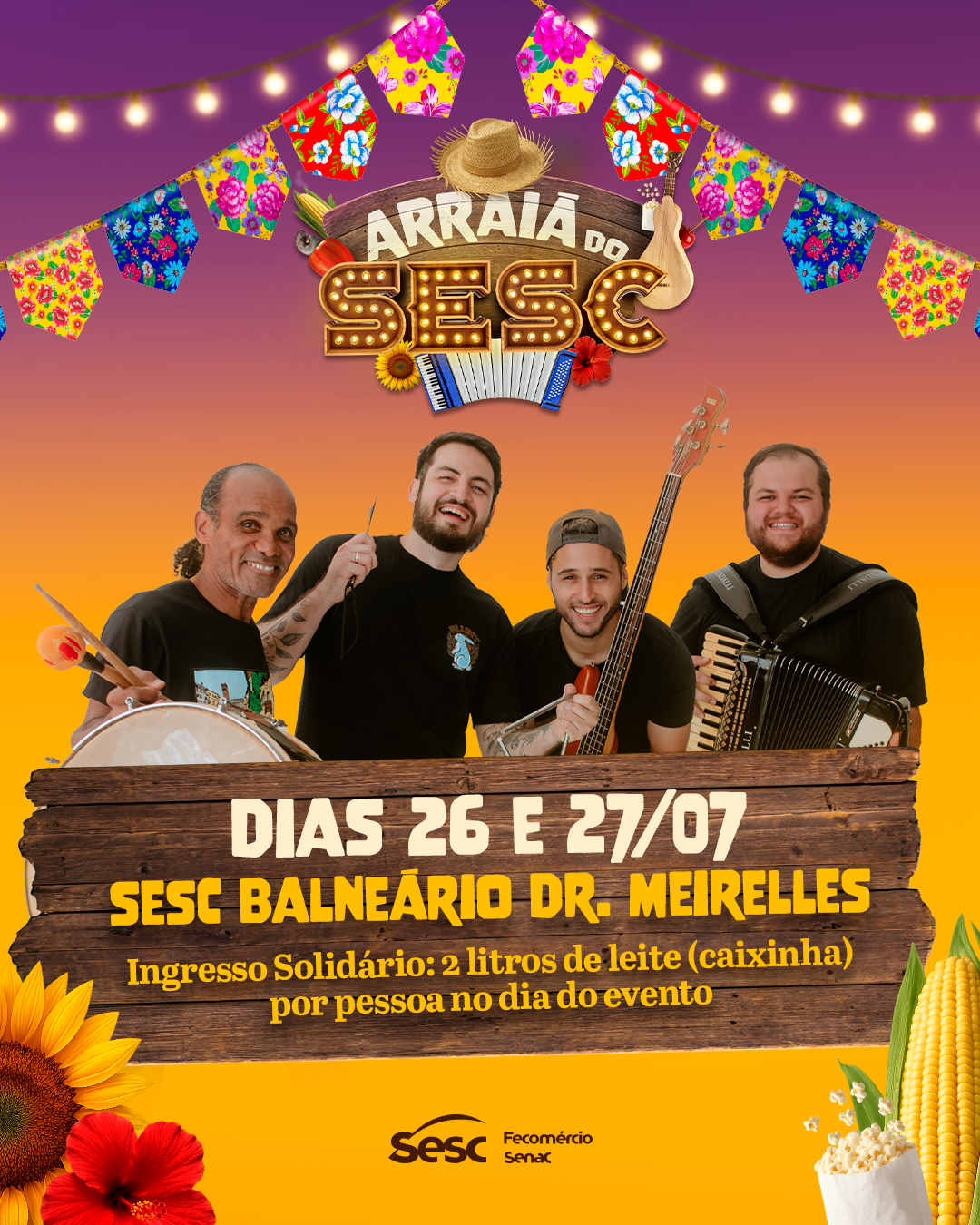 Nos dias 26 e 27, o Sesc Balneário Dr. Meirelles irá encerrar a programação do Arraiá do Sesc com muitas oficinas, brincadeiras e atividades para toda a família. A entrada será solidária, realizada mediante a entrega de dois litros (ou caixinhas) de leite e