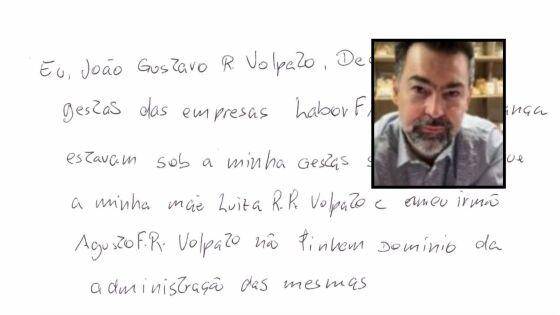 “Eu, João Gustavo Ricci Volpato, declaro que a gestão das empresas Labor FM e RV Cobrança estavam sob a minha gestão somente. E que a minha mãe Luiza R.R. Volpato e irmão Augusto F. R. Volpato não tinham domínio da administração das mesmas”, diz a declaração assinada pelo empresário.