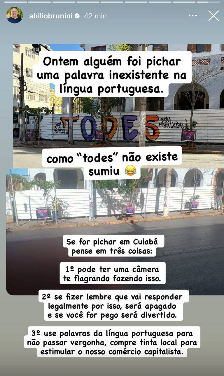 O prefeito Abílio Brunini(PL) mandou apagar hoje(13) a pichação com a palavra “todes” feita no tapume metálico na Praça Alencastro, em frente à Prefeitura de Cuiabá e mandou recado para o pichador. “Ontem alguém foi pichar uma palavra inexistente na língua portuguesa. Como ‘todes’ não existe, sumiu", disse ele em suas redes sociais.