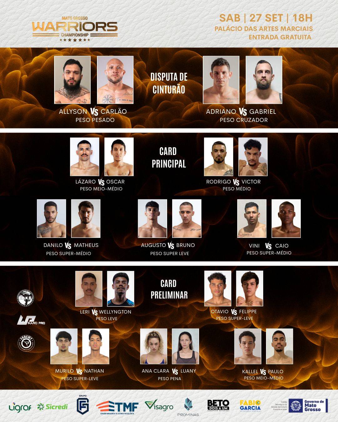 A entrada é gratuita. O card completo conta com 12 lutas, incluindo as disputas de cinturão. Na categoria peso cruzador, disputam o título Gabriel Pertusi "Pérola" de Araújo (Barra do Garças - MT) e Adriano de Oliveira Souza (Cuiabá - MT). Já no peso pesado, sobem ao ringue José Carlos “Carlão” (Cuiabá - MT) e Allyson Campos (Paraná).