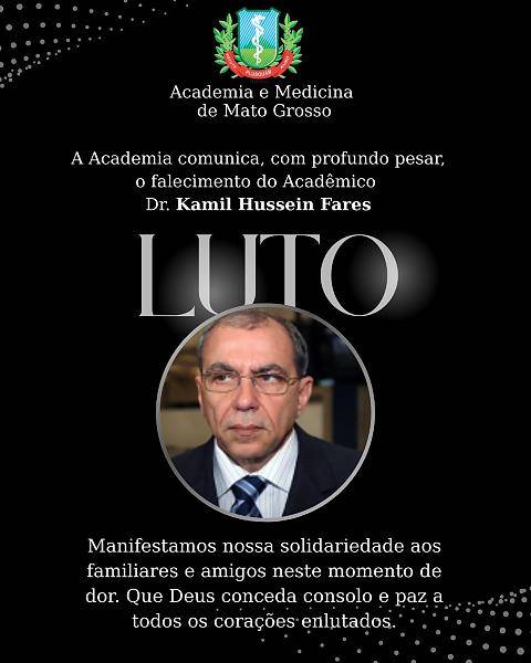 A Academia de Medicina de Mato Grosso comunicou a morte do médico Acadêmico Dr. Kamil Hussein Fares, fundador e titular da Cadeira nº 6, cujo patrono é Artaxerxes Nunes da Cunha.