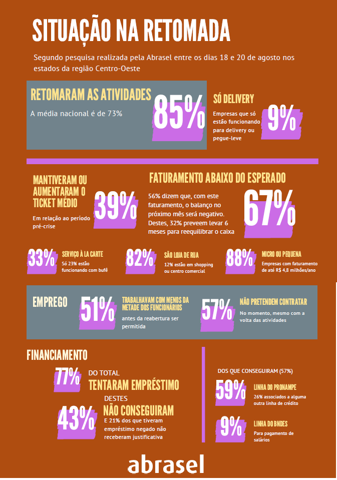 Com o objetivo de conhecer a realidade das empresas de alimentação fora do lar, a Associação Brasileira de Bares e Restaurantes (Abrasel) realizou uma pesquisa com empresário do setor, entre os dias 18 e 20 de agosto de 2020, em todo o território nacional e constatou que os bares, restaurantes e congêneres foram os mais atingidos pela crise, em todos os aspectos, pagando a conta de modo desproporcional. De acordo com a pesquisa, na região Centro Oeste, 67% dos estabelecimentos dizem que o faturamento está abaixo do esperado. Do total, 56% dizem que, com este faturamento, o balanço no próximo mês será negativo. Destes, 32% preveem levar 6 meses para reequilibrar o caixa. "Em Mato Grosso, antes da pandemia existiam 20 mil CNPJs no setor de alimentação fora do lar, porém, 10% deles não conseguiu reabrir no primeiro momento, e a previsão é de que 40% dessas empresas fecharão as portas, gerando desemprego de aproximadamente 10 mil pessoas, uma vez que não houve contratações para retomada e o fechamento amarga ainda mais prejuízos", revela a presidente da Abrasel-MT, Lorenna Bezerra. Ainda conforme a pesquisa, no Centro Oeste, 77% dos empresários tentaram empréstimos financeiros, porém, 43% desse total não conseguiu o auxílio, sendo que 21% dos que tiveram empréstimo negado, não receberam qualquer justificativa sobre o motivo da não aprovação. 9% das 85% que retomaram as atividades estão funcionando apenas para delivery ou pegue-leve. "Essa modalidade não sustenta, não traz renda. Muitos restaurantes aqui em Cuiabá não conseguiram trabalhar com delivery e permaneceram fechados durante todo o período de quarentena", explica a presidente. Outro ponto que tem prejudicado o setor é a restrição no horário de atendimento no jantar. "Cuiabá é muito quente e o cuiabano tem costume de sair tarde. A maioria chega às 21h no restaurante e, com horário de fechamento às 22h, acaba dificultando o tempo de atendimento", acrescenta Lorenna. A fim de colaborar com a saúde pública, a Abrasel preparou uma cartilha que visa alinhar as ações de retorno ao funcionamento dos bares e restaurantes em Mato Grosso, que vão desde orientar sobre o manuseio e assepsia dos utensílios e estrutura dos estabelecimentos, orientar sobre medidas de proteção junto aos clientes, fornecedores, trabalhadores, terceirizados e prestadores de serviços, expor de maneira clara o que caracteriza o “Restaurante Responsável e Consciente”.