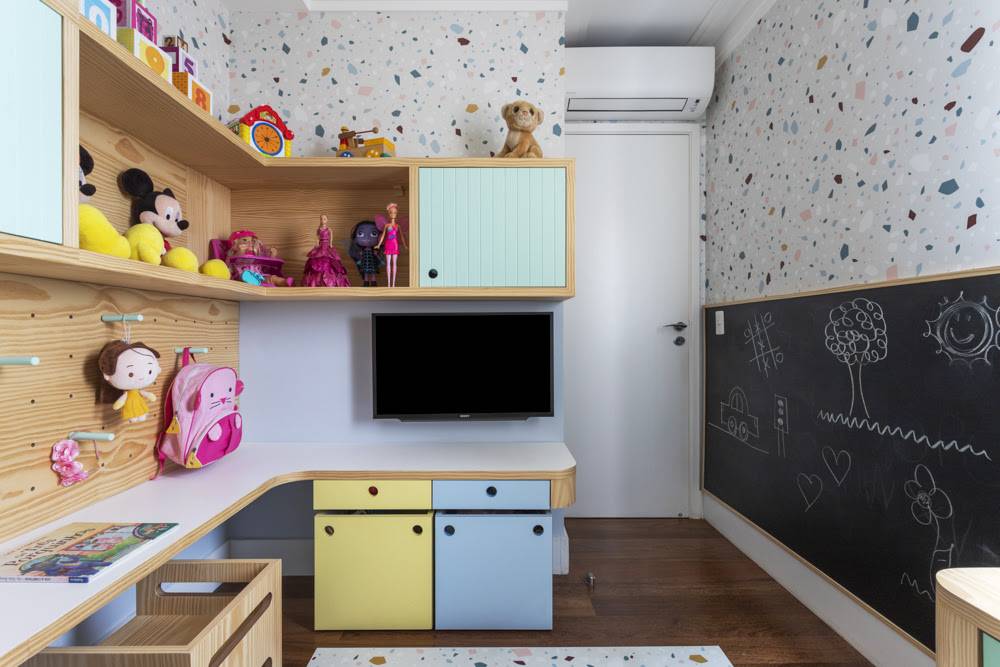 Com inspiração no Lego, a marcenaria ressalta os encaixes das peças no móvel com armários e gavetas, além dos nichos. No segundo ambiente, a estante de madeira abriga os brinquedos, podendo abranger livros e materiais escolares, seguindo o crescimento da menina. | Fotos: Thiago Travesso