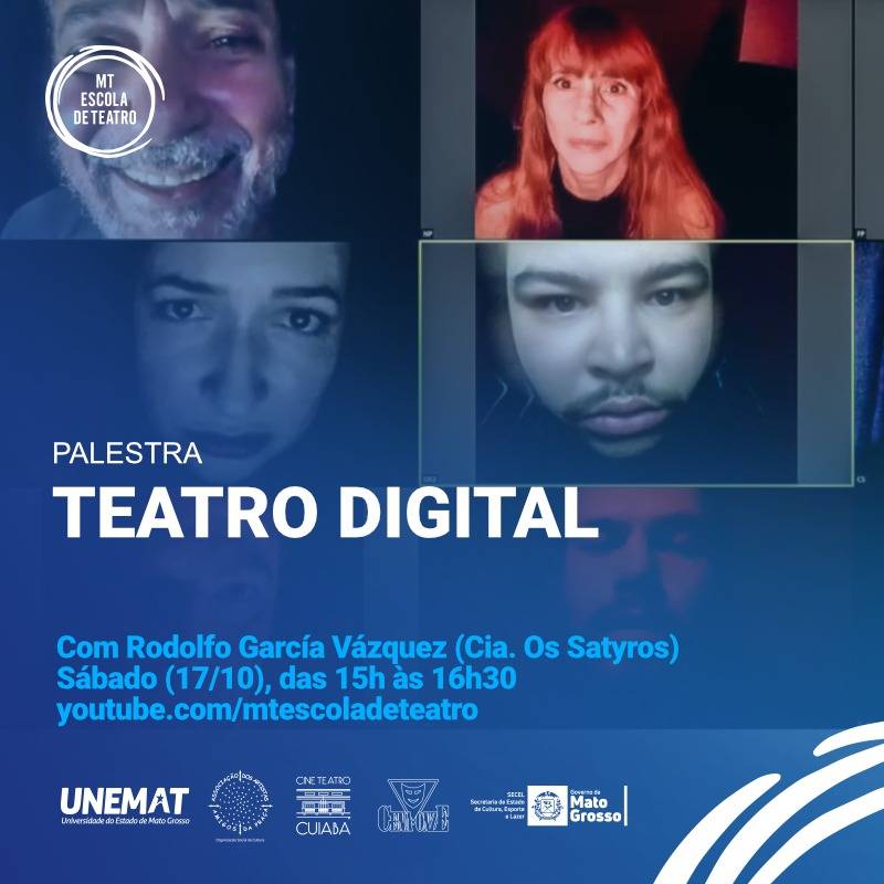 A MT Escola de Teatro promove neste sábado (17) a Palestra "Teatro Digital". O tema será ministrado pelo renomado dramaturgo e diretor Rodolfo García Várquez. O evento acontece das 15h às 16h30, pelo canal da Escola, na plataforma online Youtube, no endereço MT Escola de Teatro.