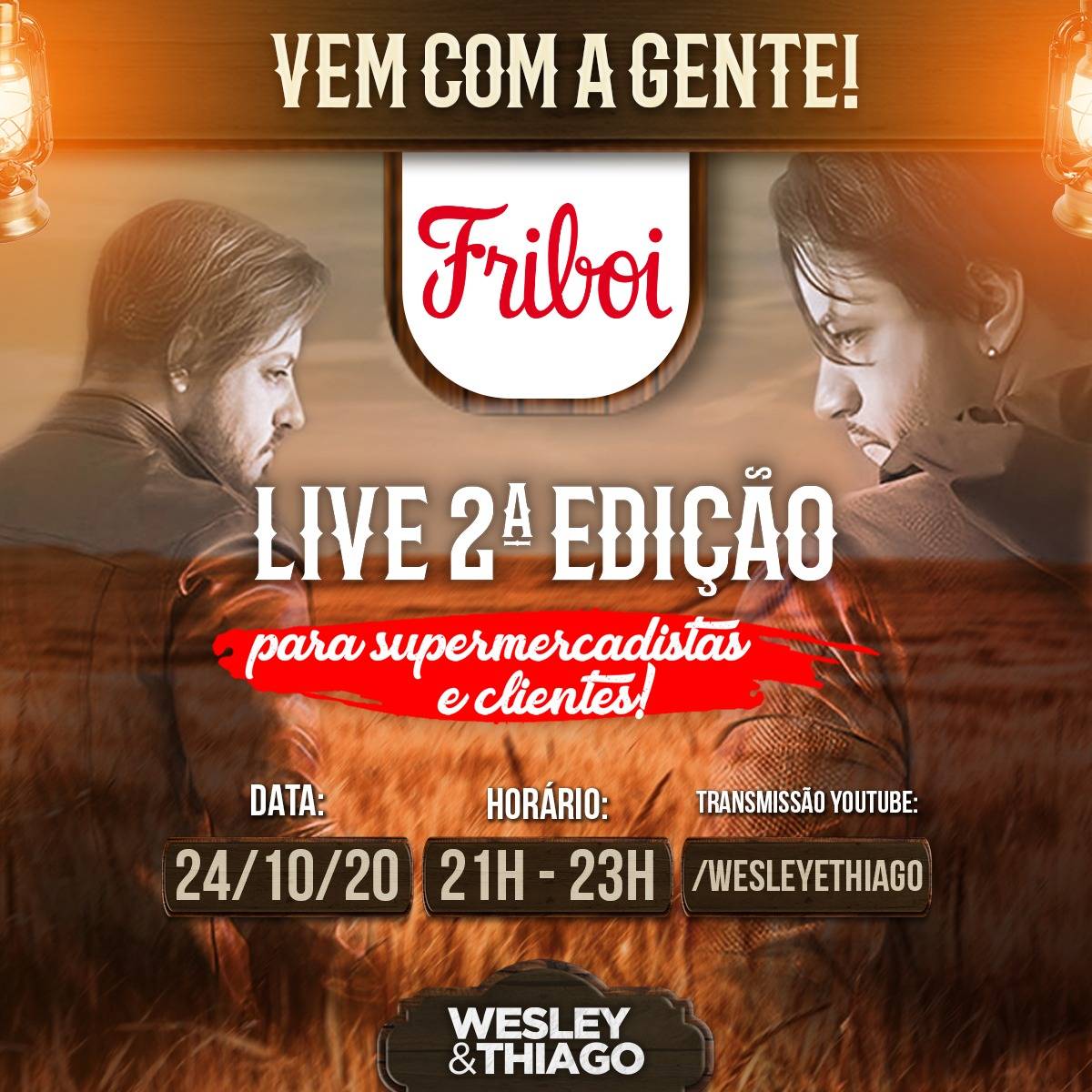 A Friboi, marca líder de carne bovina do Brasil, será uma das patrocinadoras da 2ª live da dupla Wesley & Thiago, que será realizada neste sábado (24), a partir das 21h. O evento contará com exibição pelo canal dos artistas no YouTube e será uma homenagem de empresas da indústria alimentícia em agradecimento à parceria com supermercadistas e clientes.
