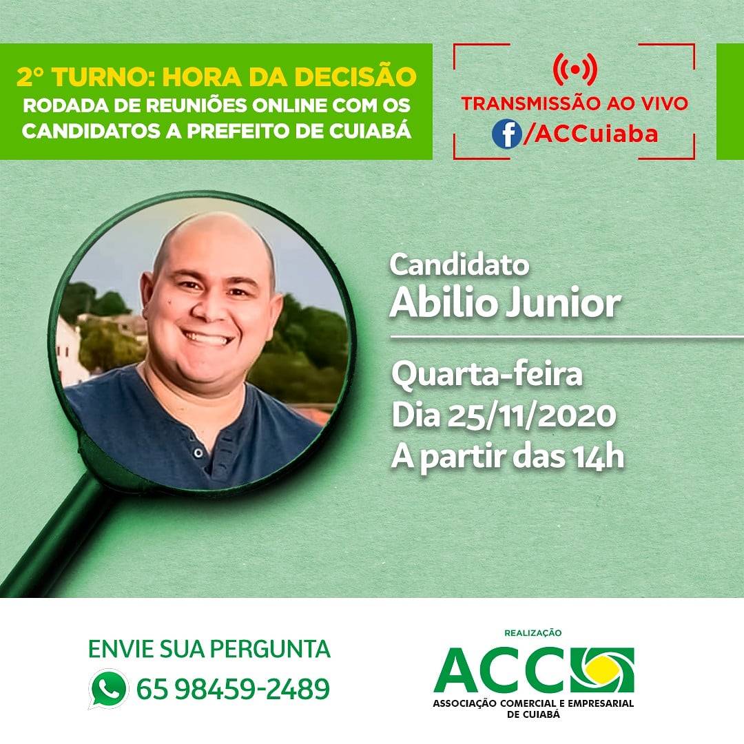 A Associação Comercial e Empresarial de Cuiabá (ACC) realiza nesta quarta-feira (25.11), às 14h, um encontro on-line com o candidato à Prefeitura da capital, Abílio Junior (Podemos). Na segunda-feira (23), a conversa foi com Emanuel Pinheiro (MDB).