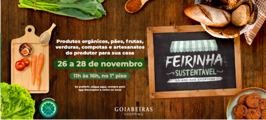 O Goiabeiras Shopping, em parceria com a Rede de Cooperação Solidária de Mato Grosso (Recoopsol), realiza a partir desta quinta-feira (26.11), até sábado, uma Feirinha Sustentável com diversos produtos orgânicos como pães, doces, frutas, verduras, legumes e artesanato. O espaço com as barracas está localizado no 1º piso e vai funcionar das 11h às 16h.