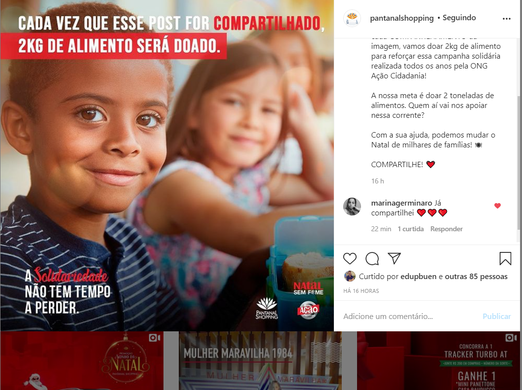 A cada compartilhamento do post feito pelo shopping no Instagram (@Pantanalshopping), o empreendimento vai doar 2 kg de alimentos para a campanha. Quanto mais compartilhamentos, mais alimentos serão doados.