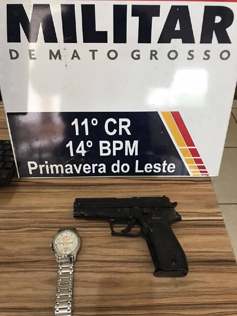 Em Primavera do Leste (a 231 km de Cuiabá), policiais do 14º Batalhão de Polícia Militar apreenderam dois adolescentes, ambos de 15 anos, por tentativa de roubo com reféns, crime para o qual estavam usando arma de brinquedo, uma imitação de pistola.