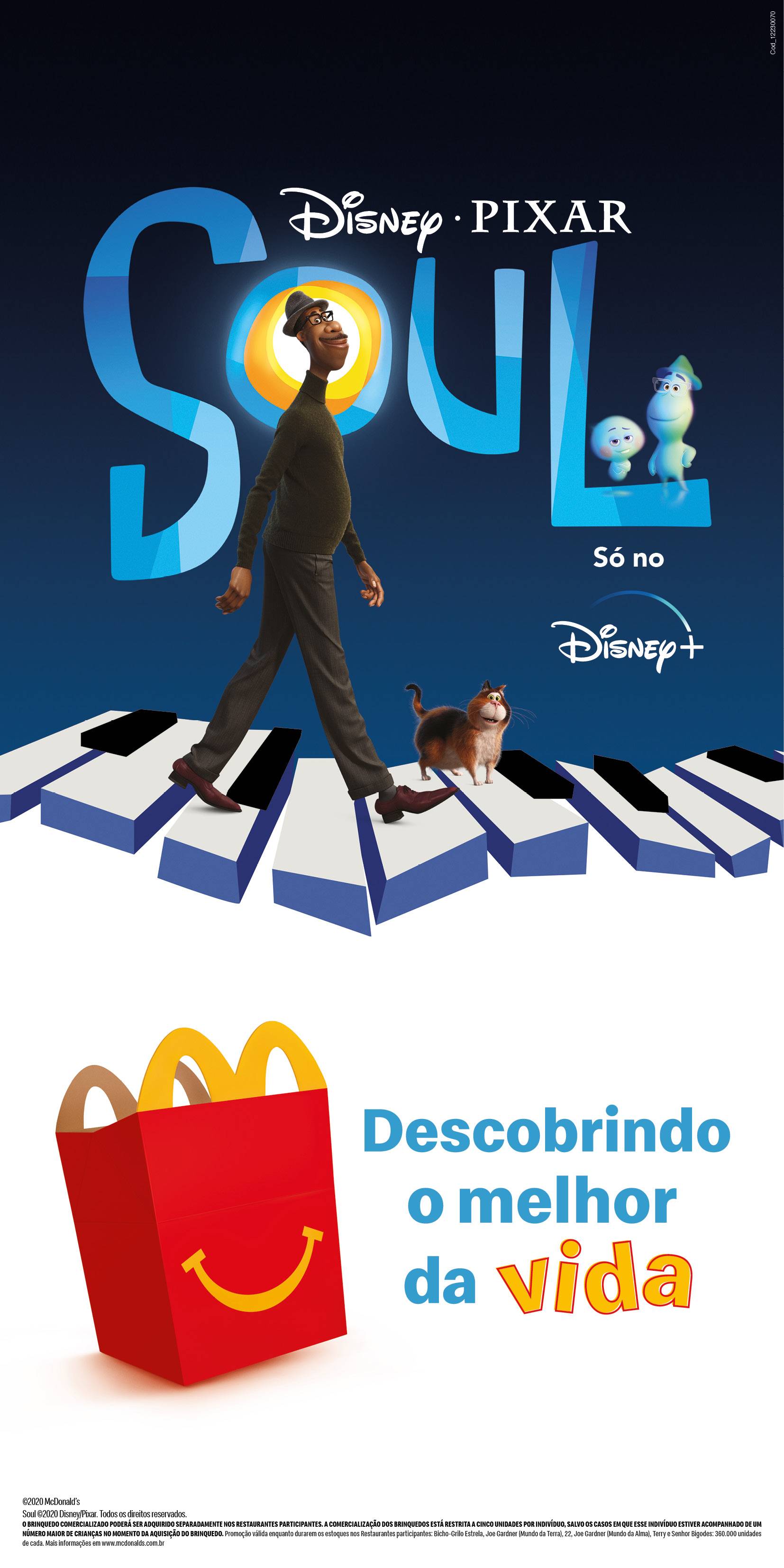 A partir de 30 de dezembro, depois do sucesso de “Stars Wars: A Ascensão Skywalker” e “Dois Irmãos: Uma jornada fantástica”, será a vez dos brinquedos inspirados nos personagens do filme “Soul”, da Disney e Pixar estrelarem a nova campanha do McLanche Feliz. A aguardada animação da Pixar Animation Studios teve estreia exclusiva em 25 de dezembro, só no Disney+, e conta a história de Joe Gardner, um professor de música que tem a oportunidade de tocar no melhor clube de jazz da cidade e vive uma jornada cheia de aventura, propósito, sonhos e amizade.