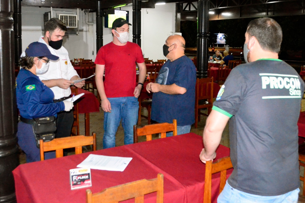 A operação iniciou com a notificação de dois restaurantes. Já passava das 21h30, mas ainda apresentavam clientes no interior das empresas, o que é vedado de acordo com o Decreto. Pelo que rege a medida, até as 21h30 o funcionamento já deve ser encerrado. “Por isso a carência de 1 hora para o toque de recolher”, justificou o secretário de Trânsito e Transporte Urbano Hermann Frederich.