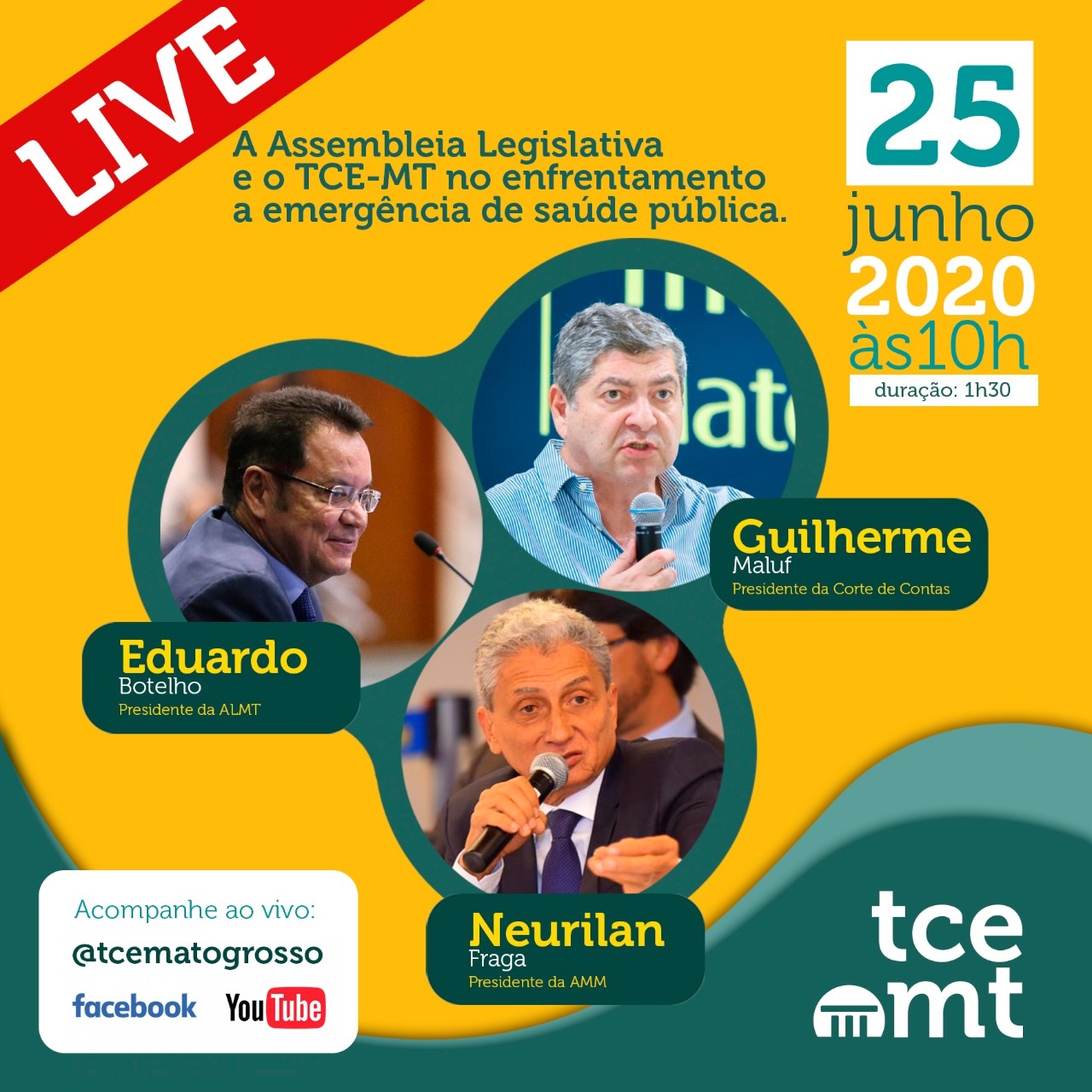 Com o tema “A Assembleia Legislativa e o TCE-MT no enfrentamento à emergência de saúde pública”, a Escola Superior de Contas promove, às 10h desta quinta-feira (25), uma live com os presidentes da Corte de Contas, conselheiro Guilherme Antonio Maluf, da Casa de Leis, Eduardo Botelho, e da Associação Mato Grossense dos Municípios (AMM), Neurilan Fraga.