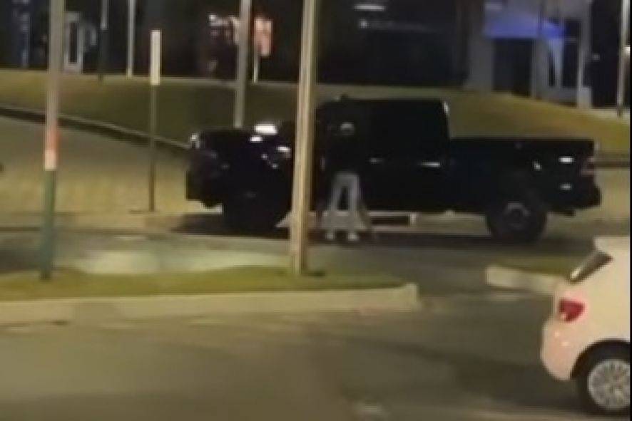 O casal encostado em uma caminhonete preta ' mandou ver' e ao redor a polícia passava com uma viatura.