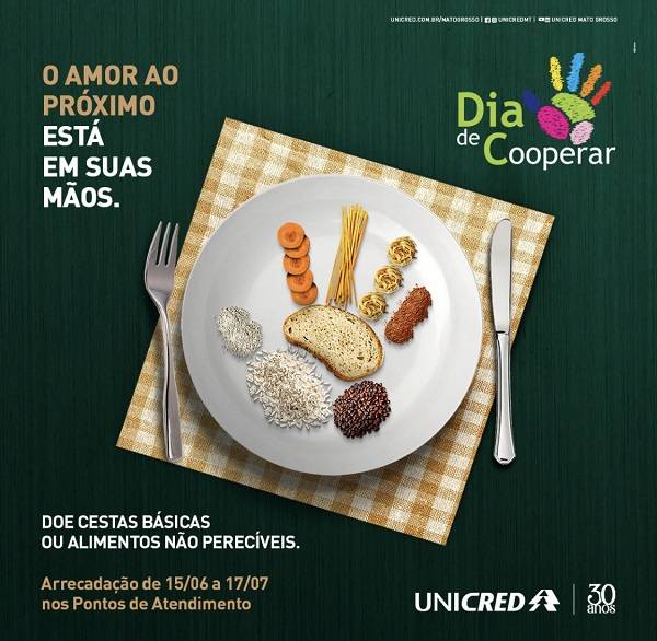 A Unicred Mato Grosso já está arrecadando cestas básicas ou alimentos não perecíveis para o Dia C (Dia de Cooperar), comemorado em todo o Brasil no primeiro sábado de julho, Dia Internacional do Cooperativismo. As doações podem ser feitas nos municípios onde a cooperativa possui Pontos de Atendimento (PA's). A campanha vai até o dia 17 de julho.