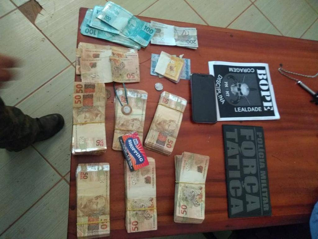 Além do dinheiro, os policiais apreenderam junto com eles um revólver calibre 38, uma espingarda calibre 12, roupas camufladas, coturnos, luvas, celulares e bateria externa de celular.
