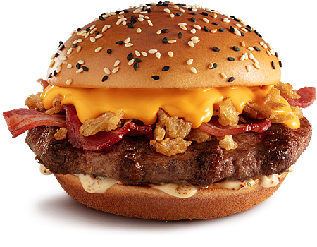 Picanha Cheese Salada - Hambúrguer de picanha, deliciosas fatias de queijo cheddar e queijo emental derretidas, o exclusivo molho picanha e a crocante cebola crispy do Méqui.