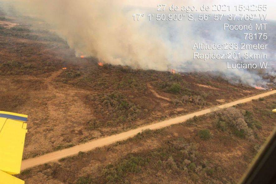 Na Transpantaneira, o incêndio segue ativo e os militares estão na força-tarefa de combate em solo, além do reforço de uma aeronave modelo Air Tractor, lançando 1.800 litros d’água nos pontos com maior incidência de fogo.