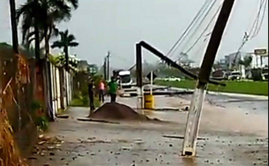 Ao menos três postes da rede de energia elétrica caíram em uma avenida, com a força dos ventos. Outros dois tiveram avarias e houve interrupção no fornecimento de energia em uma parte da cidade.