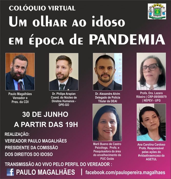 O encontro virtual tem a realização da Comissão de Direitos do Idoso da Câmara Municipal de Goiânia, presidida pelo vereador Paulo Magalhães. Para o vereador o idoso não pode ser visto como um empecilho: “São seres humanos que deram suas vidas pelos filhos e netos, são seres humanos que ajudaram a construir cidades e contribuíram muito com a sociedade, são idosos, são seres humanos que merecem todo respeito”, acrescentou o vereador.
