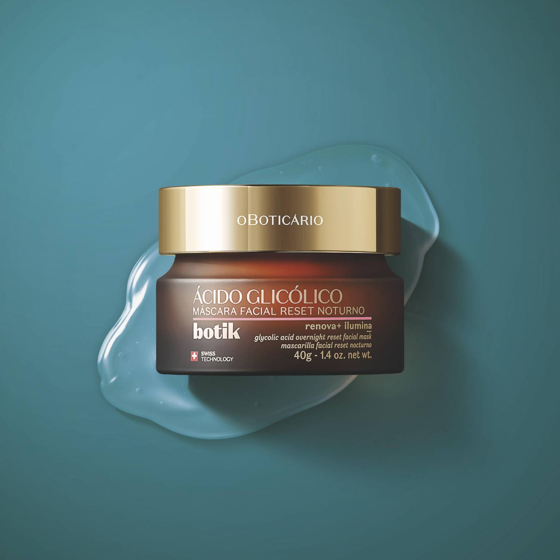 Para o lançamento Ácido Glicólico, Botik apresenta quatro produtos que podem ser incorporados na rotina de cuidados faciais. O grande destaque da linha é a Máscara Facial Reset Noturno, que promove uma esfoliação química de alta eficácia atuando em três dimensões do envelhecimento por meio de uma tecnologia de ação prolongada que age por até 8 horas. Foi realizado um teste de percepção dos efeitos do produto com 61 voluntárias e já na primeira aplicação foram percebidos resultados visíveis, como redução de linhas e uniformidade, 97% aprovaram o produto. Em textura gel e oil free, a Máscara revigora a pele deixando a textura mais lisa, macia e suave, reduzindo a oleosidade excessiva e iluminando enquanto hidrata. Também integram a linha o Sérum de Alta Potência Facial com 8% de ácido glicólico, a Geleia Concentrada de Limpeza Facial e a Solução Desincrustante Facial.