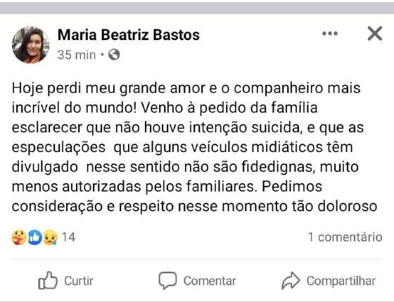 “Hoje perdi meu grande amor e o companheiro mais incrível do mundo! Venho à pedido da família esclarecer que não houve intenção suicida, e que as especulações que alguns veículos midiáticos têm divulgado nesse sentido não são fidedignas, muito menos autorizadas pelos familiares. Pedimos consideração e respeito nesse momento tão doloroso”, diz a publicação.