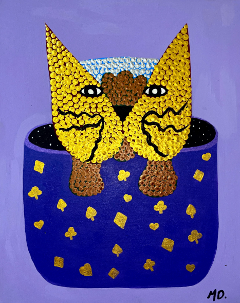 Michelle Diehl é jornalista e apresentadora, e descobriu-se artista plástica durante a pandemia. Em telas de mosaico, onde imprime a imagem de seus gatos representando as mais diversas situações e pessoas, ela encontrou o recurso que necessitava para a cura de suas crises de ansiedade, bipolaridade e depressão.